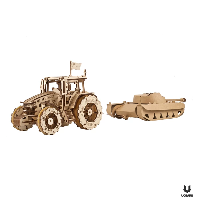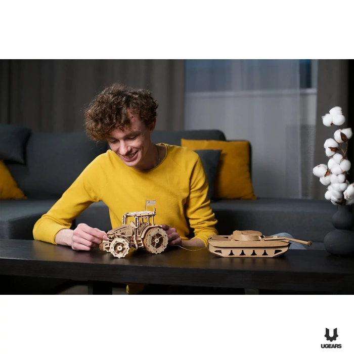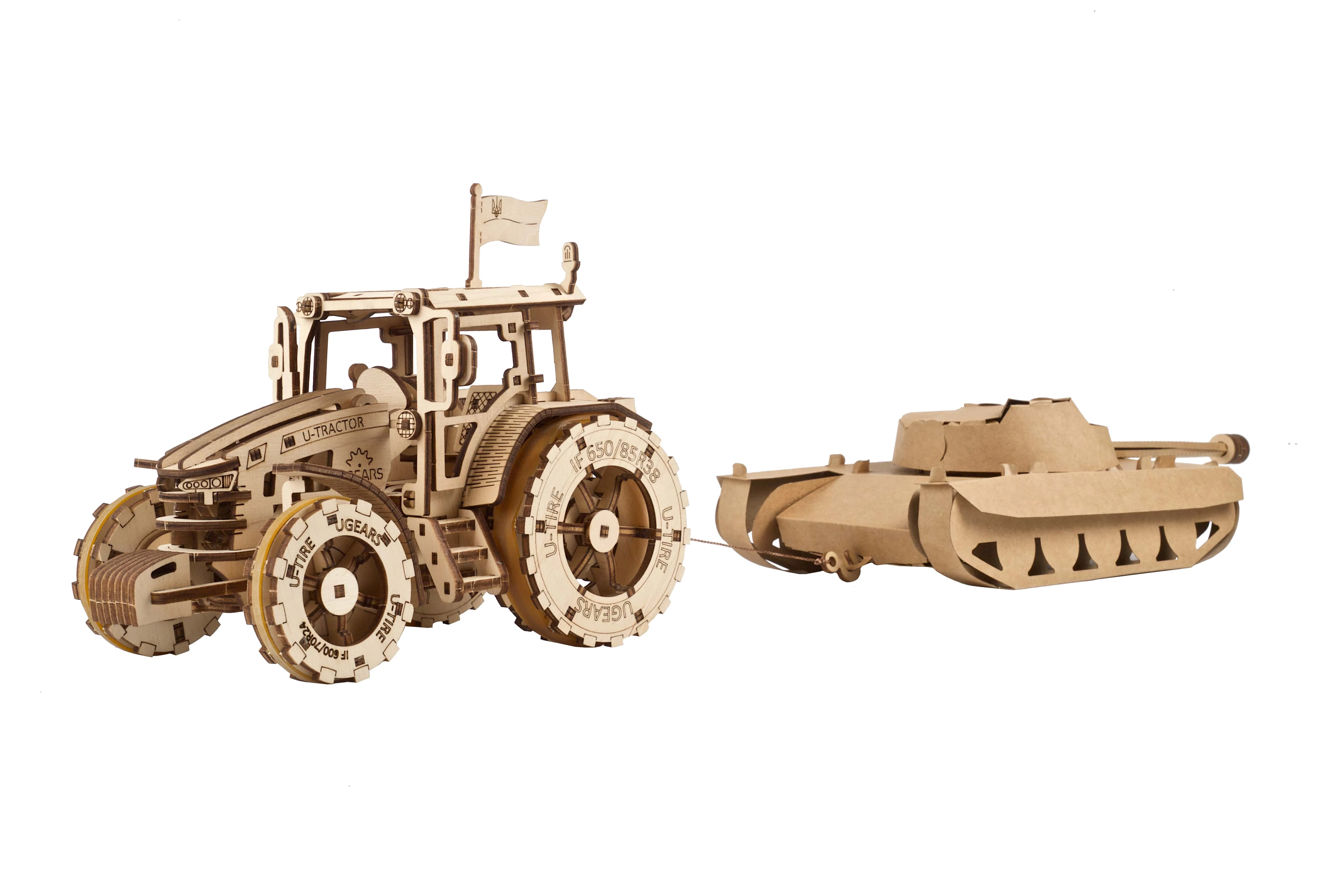 A Traktor győzelme mechanikus modellt a UGEARS az ukrán nemzetiségű mezőgazdászok tiszteletére alkotta meg. A makett két részből áll. Egy jellegzetes UGEARS dizájnnal és mechanikával rendelkező traktorból, valamint egy ehhez a járműhöz vontatókötéllel hozzákötött papírtankból. A minőségi faanyagú alkatrészekből készült traktor mechanizmusát annak alvázán található tekerhető alkatrésszel hozhatod működésbe. A jármű fülkéjében található egy kar, mely start/stop kapcsolóként szolgál. Ha leengeded a kart, akkor a szerkezetben található a rugó ereje egy ingás hajtóműrendszeren keresztül jut át a kerekekre, melyekre a jobb tapadásának elérésének érdekében gumiszalagok erősíthetők. A traktor ajtói és motorháztetője mind nyithatóak, a kerekek szögét pedig nyugodtan állíthatod manuálisan, attól függően, hogy merre szeretnéd, hogy a modell haladjon. A makettet különleges gravírozásokkal tették még egyedibbé.