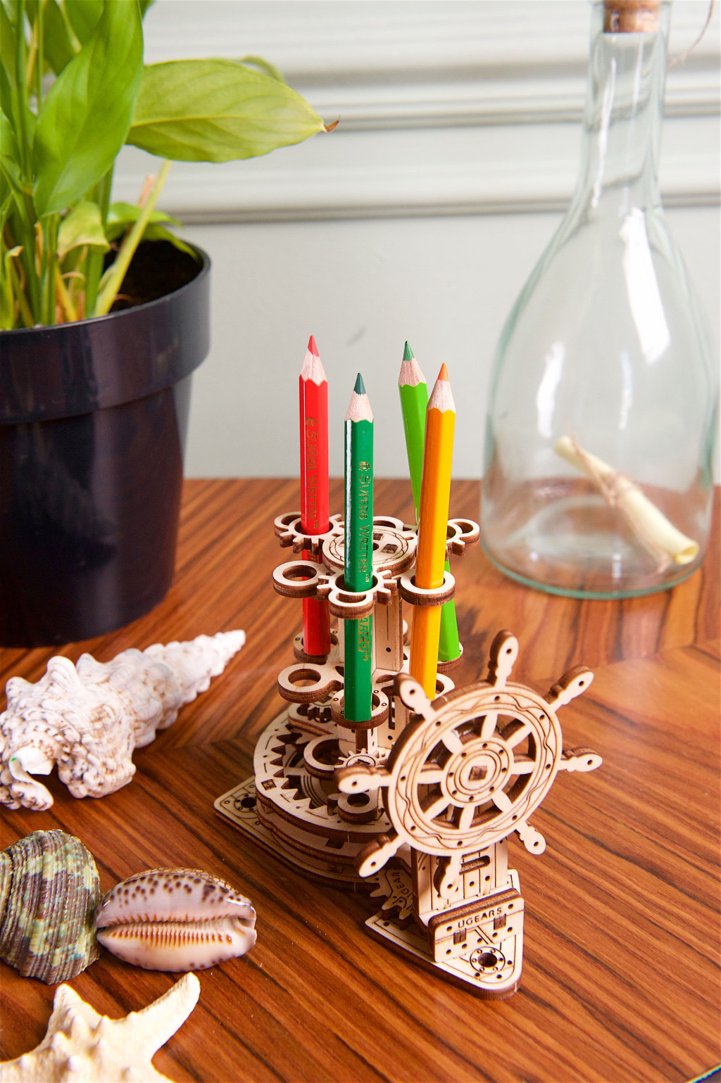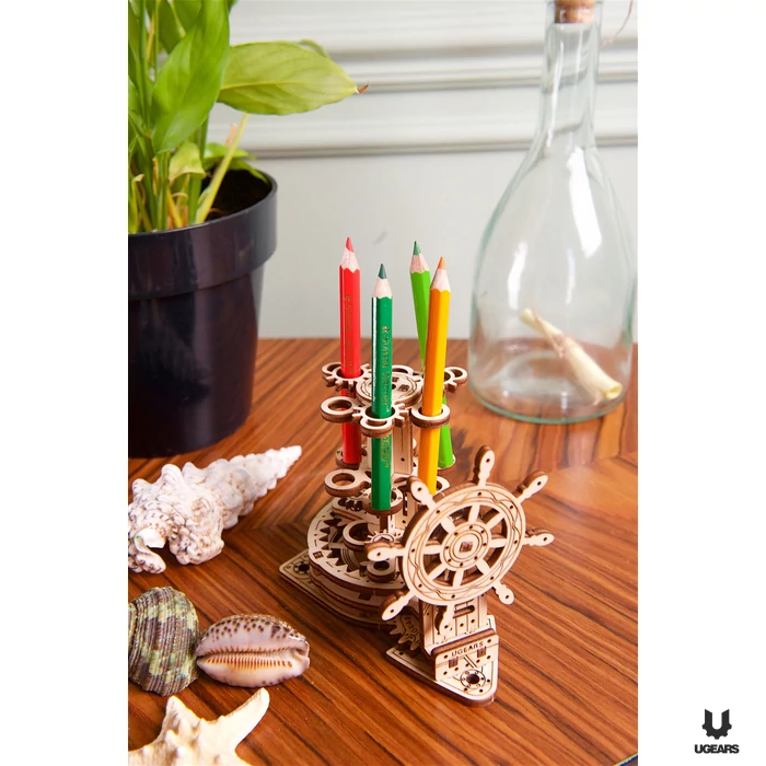 Megvan az az érzés, mikor igazán nagy káosz uralkodik az asztalodon és akárhogyan keresed, sehogy sem sikerül megtalálnod a számodra éppen szükséges íróeszközt? Általában ilyenkor fogalmazódik meg az emberekben a gondolat, hogy szükségük lenne egy asztali rendszerezőre, azonban általában megelégszenek a snassz műanyag vagy fém dobozkákon. Te miért ne lehetnél e tekintetben is egyedi? A UGEARS hajókormányt imitáló rendszerezője minden, csak nem unalmas és megszokott!