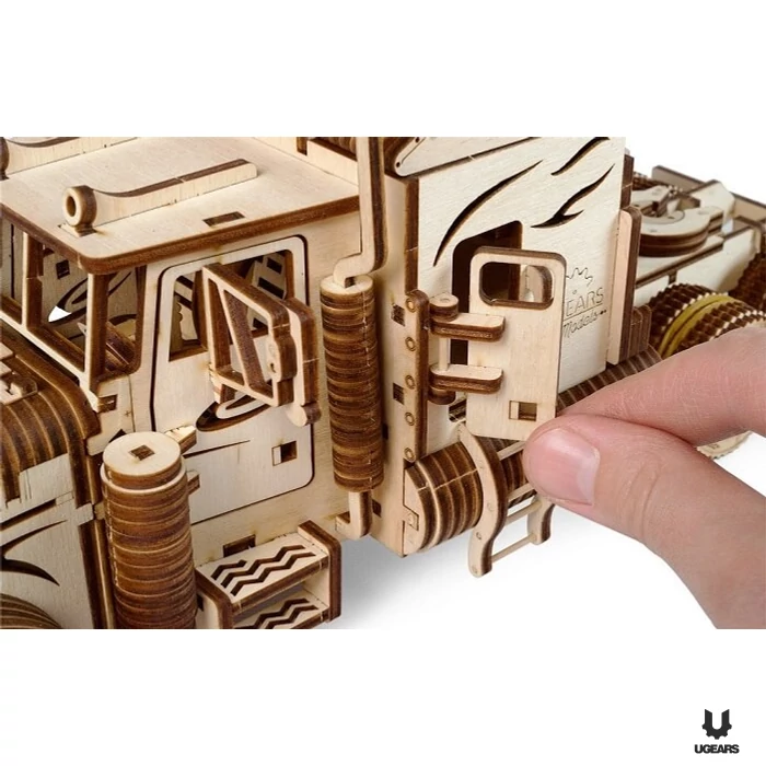 Robusztus és erős, nagyon erős. A Ugears kamionja egy R6-os, gumiszalag által hajtott motorral érkezik meg hozzád. A modellben kiépített váltórendszer rendszer három módot tesz lehetővé: járművedet manőverezhet előre, hátra vagy üresjáratba állíthatod. A részletes kivitelezés az amerikai kamionok minden ikonikus jellegzetességét felvonultatja, úgy mint például a hatalmas kipufogócsöveket és visszapillantó tükröket vagy a kapcsoló rendszert, amely összeköti a vontatót a pótkocsival. A kabin egyszerűbb elérését egy mini létra segíti. Ha bármikor szükséged lenne rá, akkor a kamion hátsó részén találsz egy lapátot és egy benzines kannát is. Mindezek felett a Heavy Boy TV-vel felszerelt, hangulatos pihenőkabint biztosít a fáradt sofőr számára!
