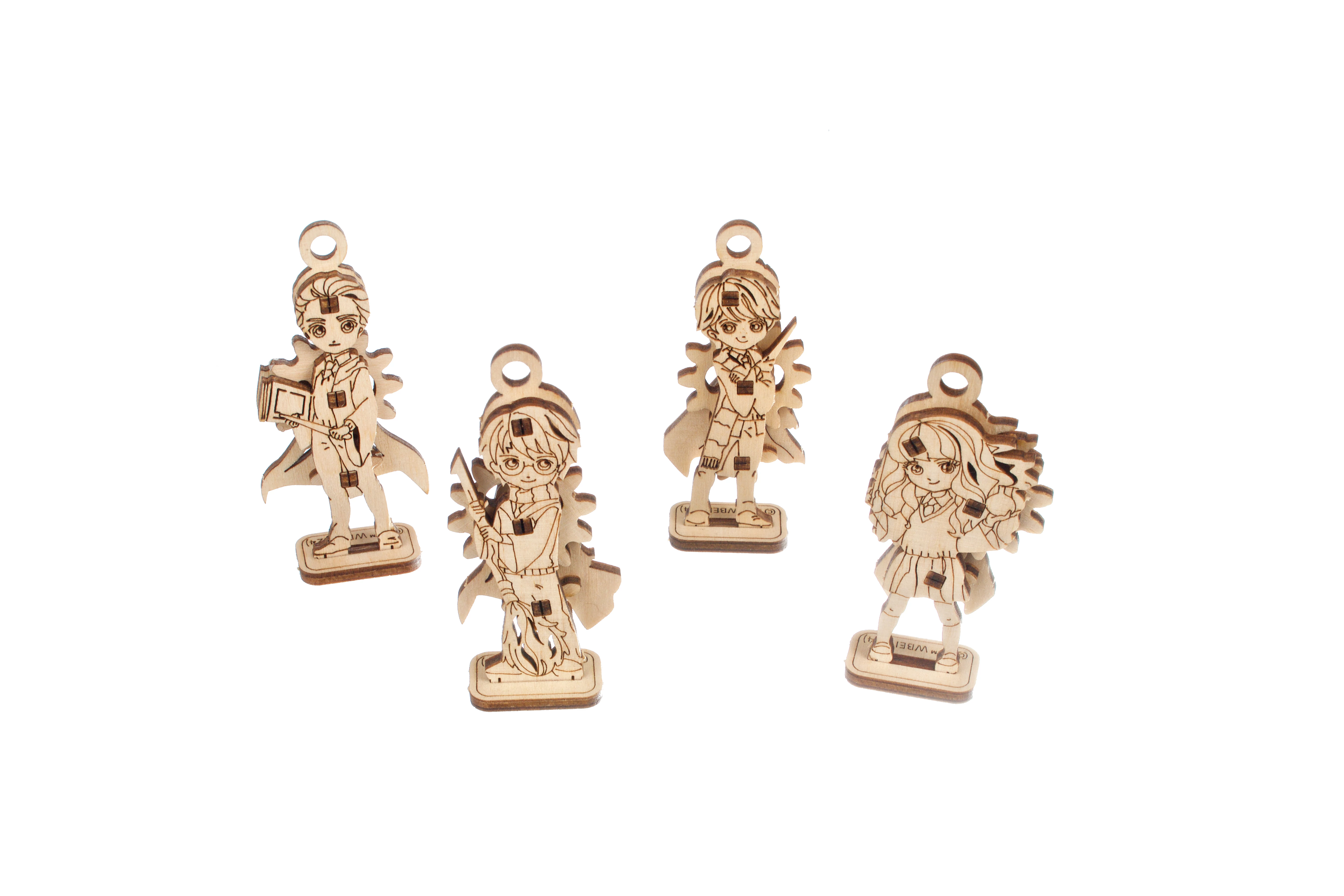 A készlet négy kis fafigurából áll, amelyeket saját kezűleg lehet összeszerelni, mindegyik egyszerű mechanikai elemekkel rendelkezik: Harry Potter (3 x 6,5 x 1,5 cm) – Egy bátor és elszánt varázsló, aki felfedezi, hogy híres a varázsló világban, mert csecsemőként túlélte Voldemort, a sötét varázsló támadását. Ron Weasley (3 x 6,5 x 1,5 cm) – Harry hűséges és vicces legjobb barátja, aki egy nagy és szerető varázsló családból származik. Hermione Granger (3,1 x 6,5 x 1,5 cm) – Egy briliáns és leleményes boszorkány, akit intelligenciájáról, hűségéről és erős igazságérzetéről ismernek. Draco Malfoy (3,3 x 6,9 x 1,5 cm) – Egy ravasz és arrogáns diák, aki gazdag, tisztavérű varázsló családból származik, és gyakran kerül összetűzésbe Harryvel és barátaival.