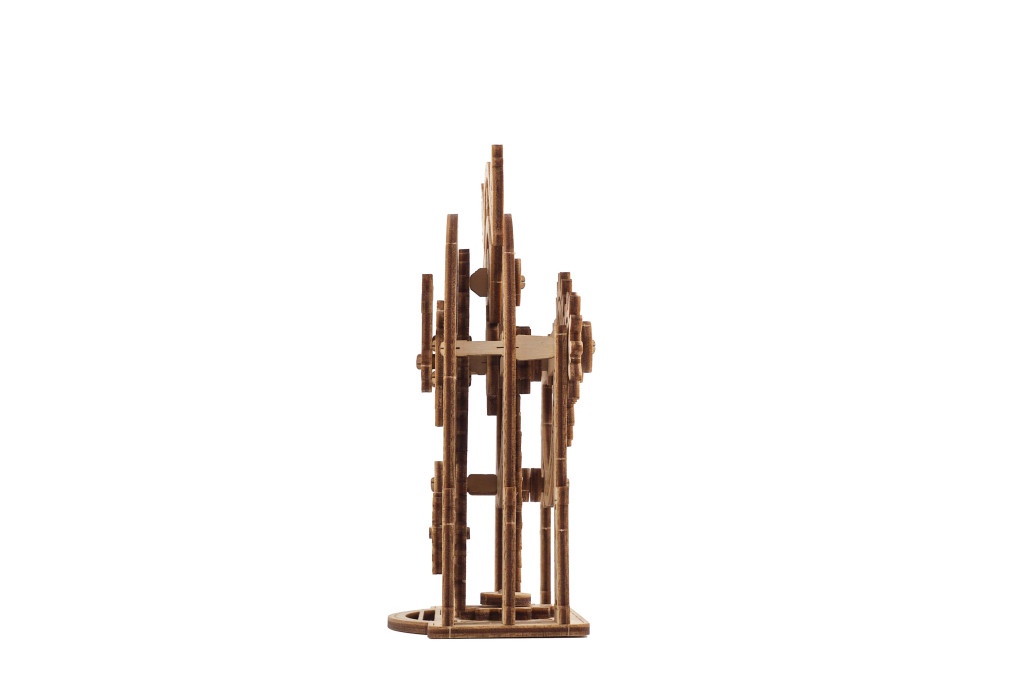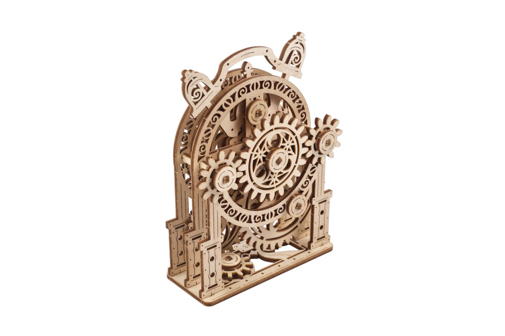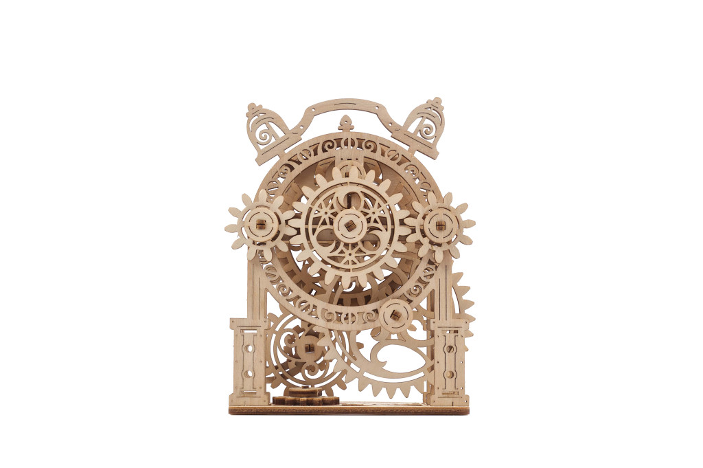 Az UGEARS Vintage ébresztő óra egy elbűvölő emlékeztető a régi időkre. Az oldalsó fogaskerekek mozgatásával az ébresztőóra mutatói forognak, és a harangok csilingelése adja a jellegzetes ébresztőhangot. Míg sok fa modell óra nem mutatja az időt, ennek az óra mutatói úgy működnek, hogy a percmutató elforgatása egy pozícióval előrébb viszi az óramutatót. Az óra számlapját díszítőelemek, mint a nap és növények teszik vonzóvá.